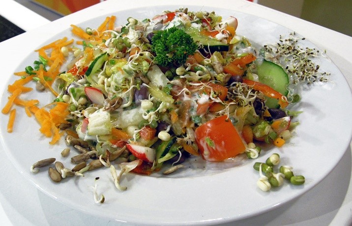 Salát a okurku dáme do velké mísy, přelijeme zálivkou. Na slát poté rozdělíme ředkvičku, výhonky a řeřichu.